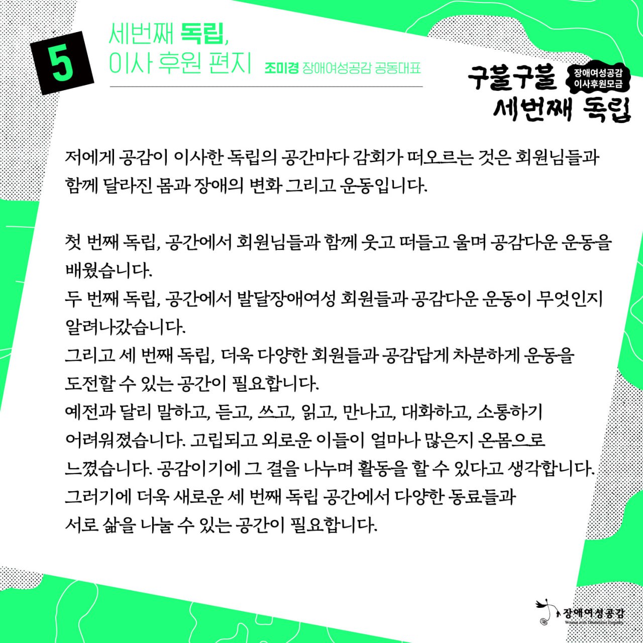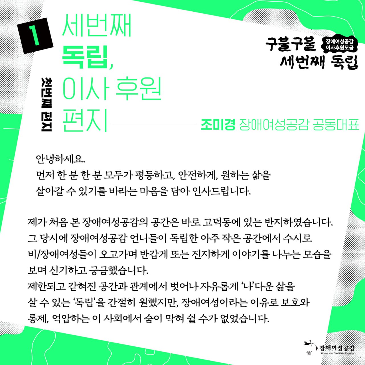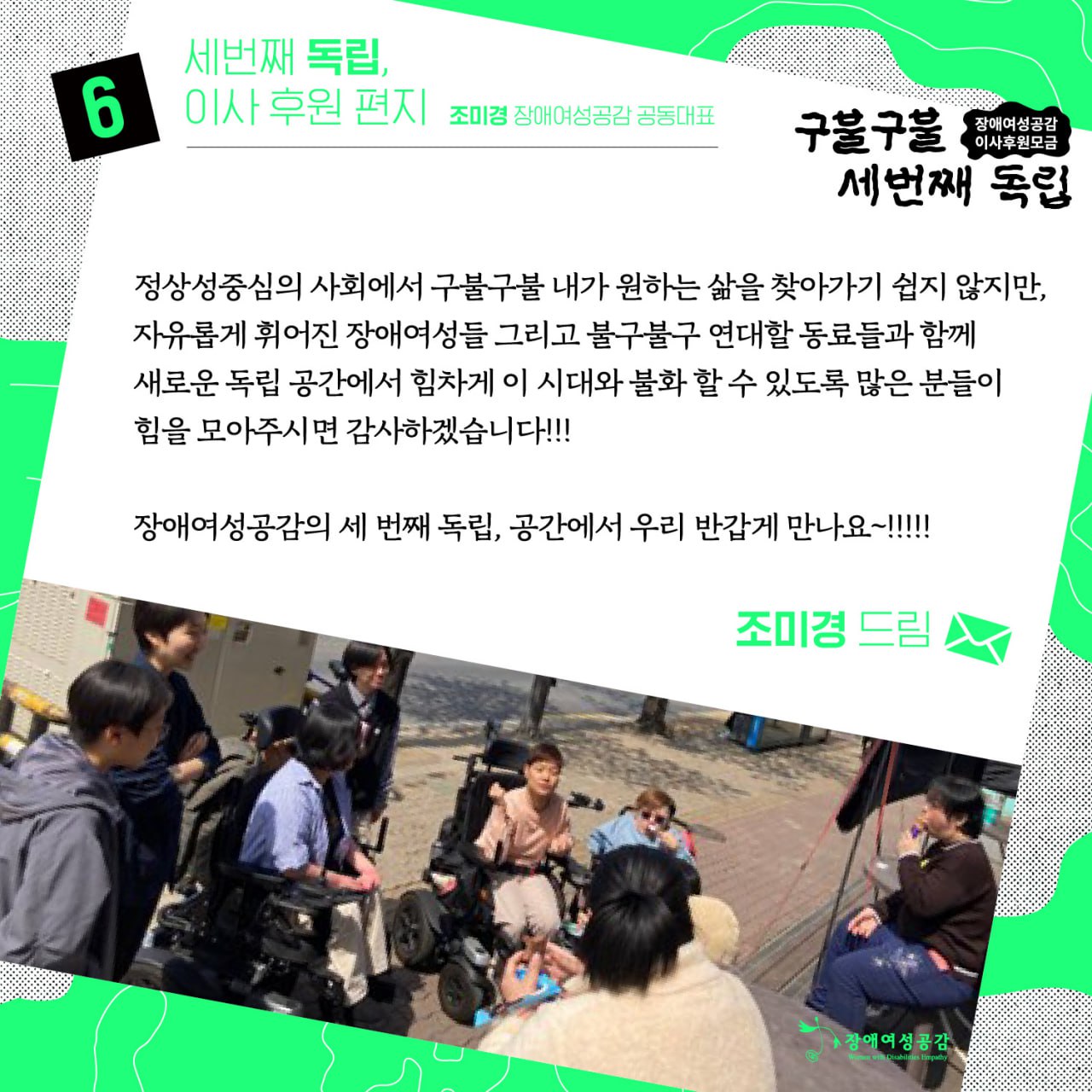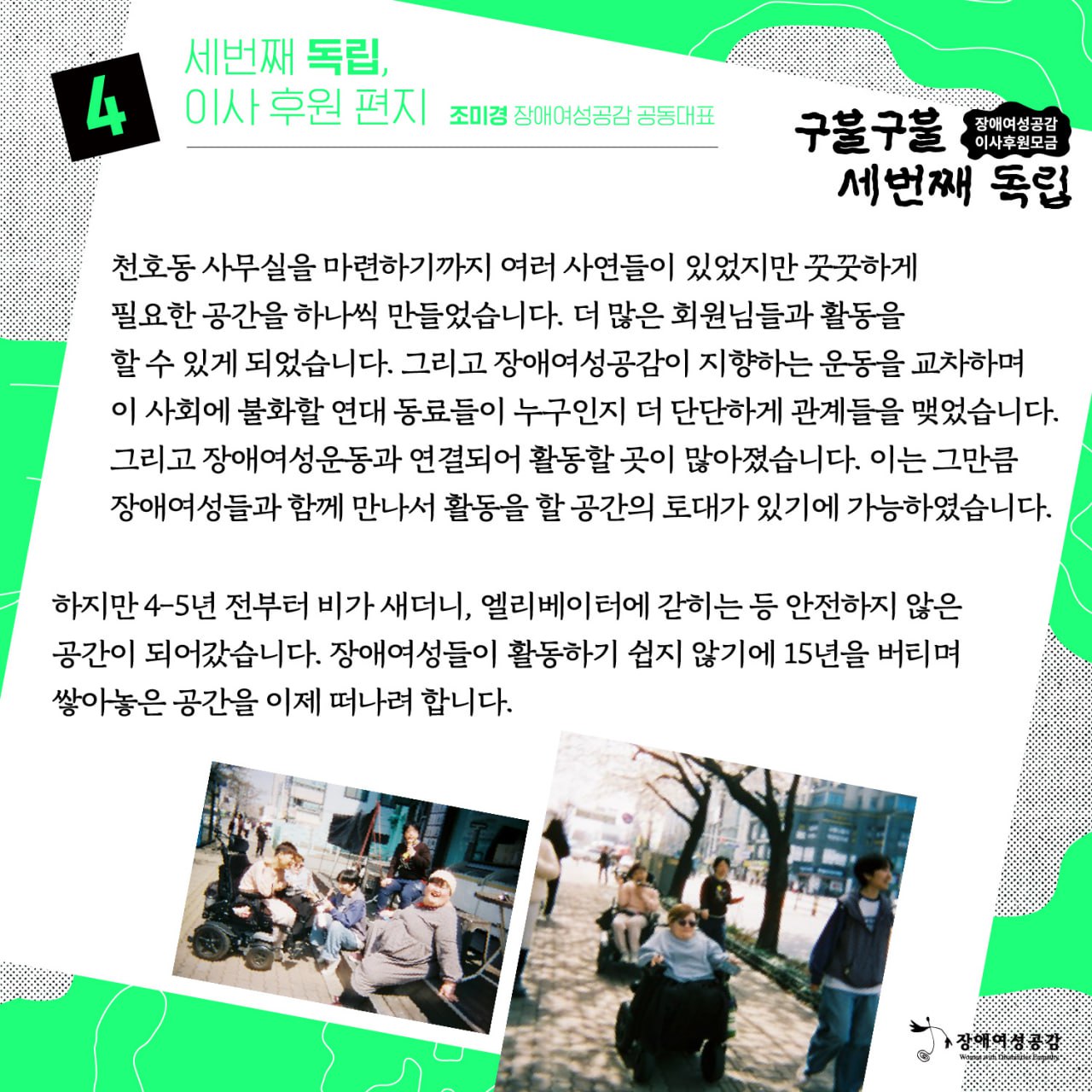 정상성중심의 사회에서 구불구불 내가 원하는 삶을 찾아가기 쉽지 않지만, 자유롭게 휘어진 장애여성들 그리고 불구불구 연대할 동료들과 함께 새로운 독립 공간에서 힘차게 이 시대와 불화 할 수 있도록 많은 분들이 힘을 모아주시면 감사하겠습니다!!!