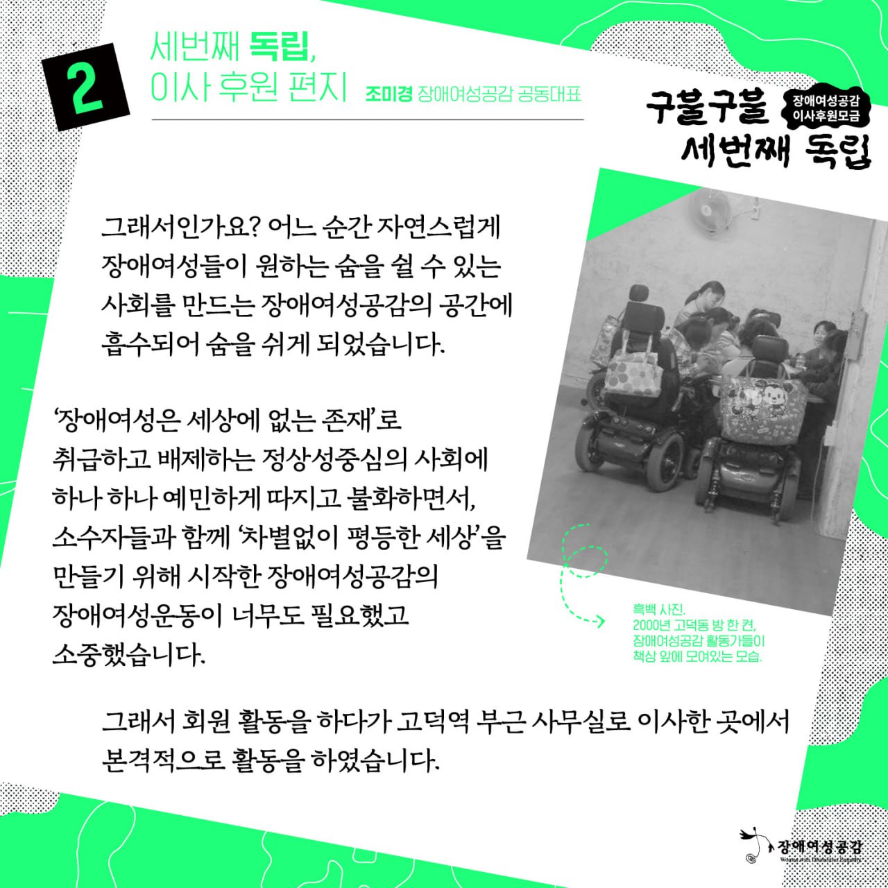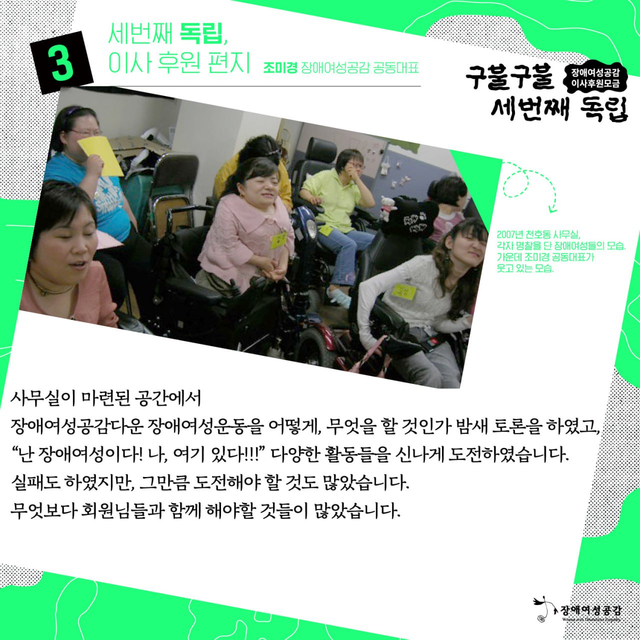 제가 처음 본 장애여성공감의 공간은 바로 고덕동에 있는 반지하였습니다. 그 당시에 장애여성공감 언니들이 독립한 아주 작은 공간에서 수시로 비/장애여성들이 오고가며 반갑게 또는 진지하게 이야기를 나누는 모습을 보며 신기하고 궁금했습니다. 제한되고 갇혀진 공간과 관계에서 벗어나 자유롭게 ‘나’다운 삶을 살 수 있는 ‘독립’을 간절히 원했지만, 장애여성이라는 이유로 보호와 통제, 억압하는 이 사회에서 숨이 막혀 쉴 수가 없었습니다.