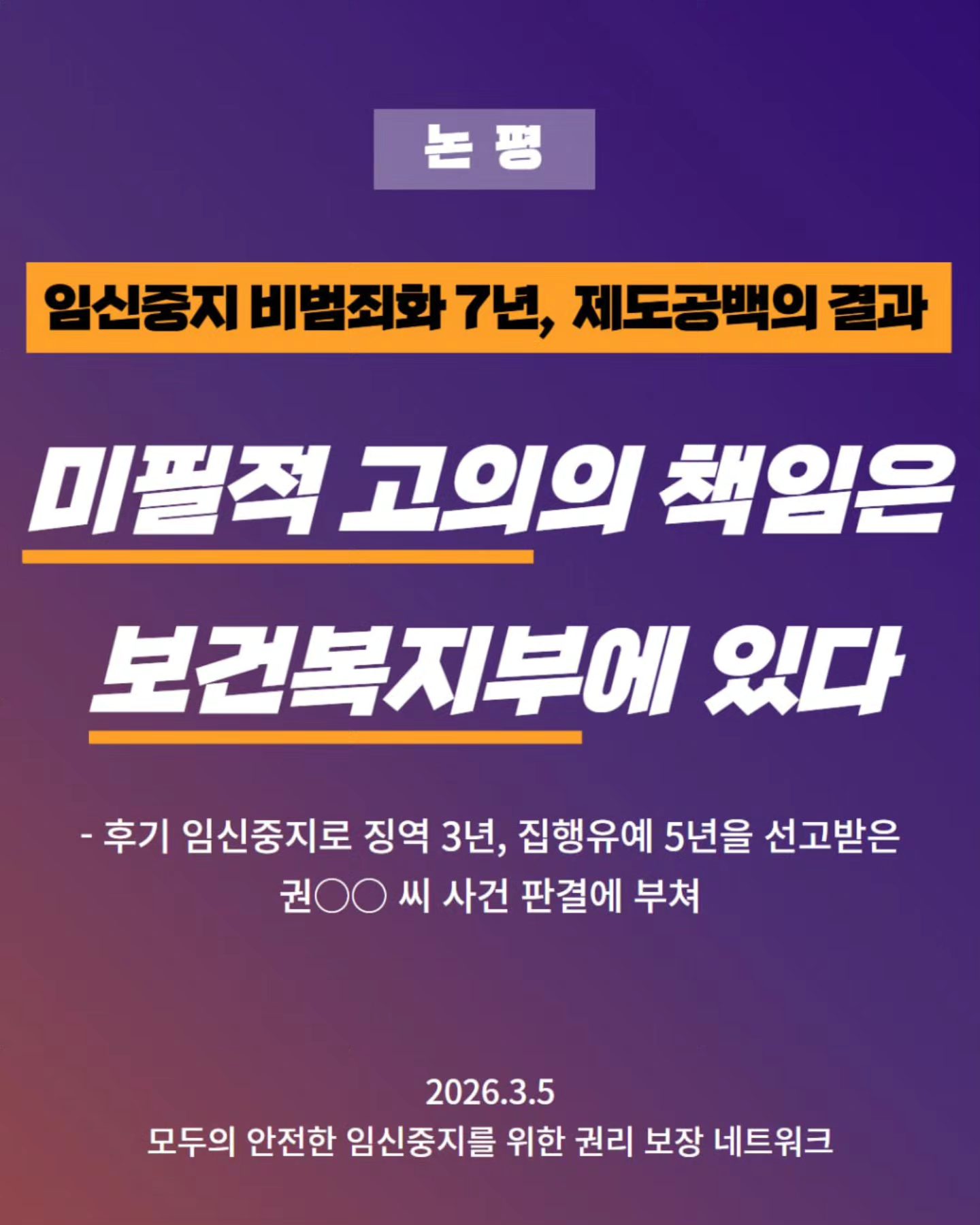 그러나 비범죄화 이후는 달라야 한다. 후기 임신중지는 자주 있는 일은 아니지만 실제로 행해지고 있는 일이며, 의료의 도움이 어느 경우보다 필요한 일이기 때문이다. 특히 태아나 산모의 건강상의 문제나 다양한 사회경제적 여건으로 인해 더욱 취약한 여건에 있는 이들일수록 임신 후기에 임신중지를 하게 되는 상황을 겪게 되기에, 환자와 의료진의 신체적, 정신적 손상을 줄일 수 있는 가장 과학적인 방법에 대한 논의와 연구를 필요로 하는 영역이다. 우리는 이와 같은 고민을 전혀 하지 않은 채, 도리어 절박한 상황에서 임신중지를 하고자 했던 한 개인에게 살인죄의 책임을 묻게 만든 보건복지부를 강력히 규탄한다. 보건복지부는 즉각 임신 전 기간에 걸쳐 임신한 사람과 의료진이 안심하고 보다 안전하게 임신중지에 관한 의료 행위를 할 수 있는 임상가이드를 마련하고, 이를 실행할 수 있는 보건의료 체계를 마련하라.