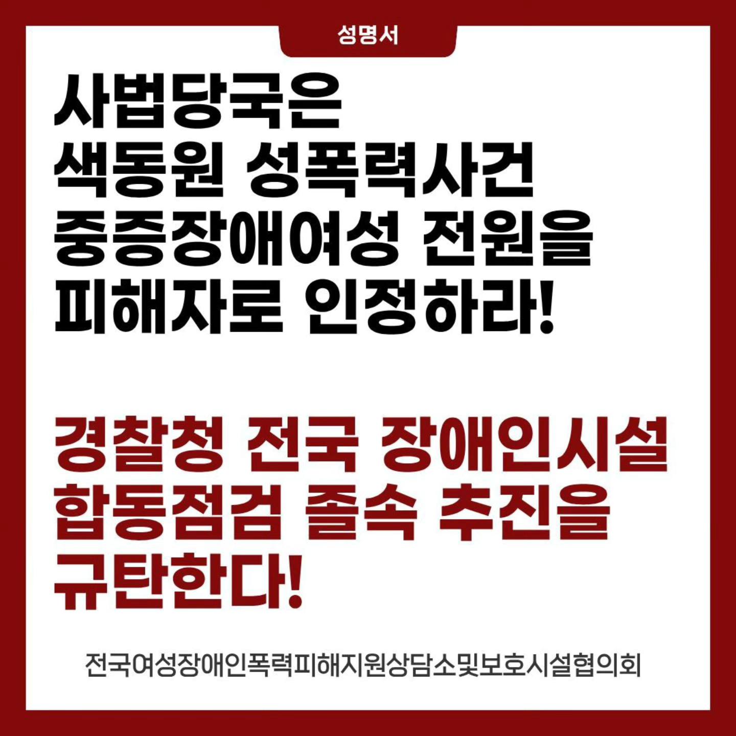 [성명] 사법당국은 색동원 성폭력사건 중증장애여성 전원을 피해자로 인정하라! 경찰청 전국 장애인시설 합동점검 졸속 추진을 규탄한다!