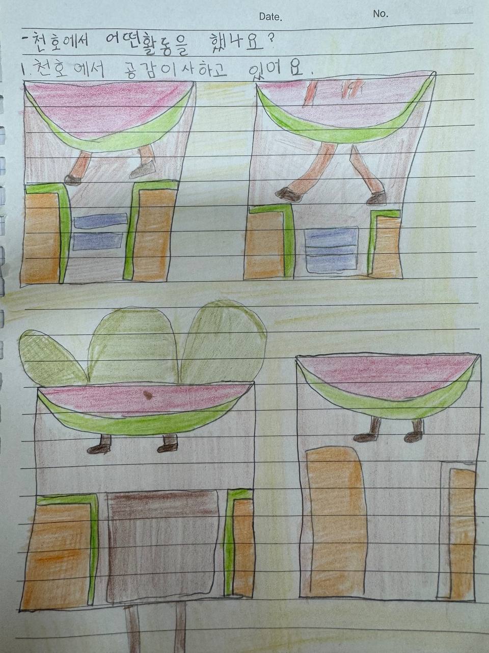 (그림 설명) 공감 이사 도와주는 거. 준비했을 때 정신 없지만 재밌었다. 공감은 일 있어서 재밌는 곳. 고덕동에서 중학교, 서울복지관에서 소개해줘서 온 기억이 난다. 기억이 점점 안 나지만 재밌었다. 다른 데는 못 갈 것 같다. 다른 데 가면 말이 안 나와서 그런 것 같다. 내 말을 안 들을 때 소리지를 수 있다. 내 말 끝.