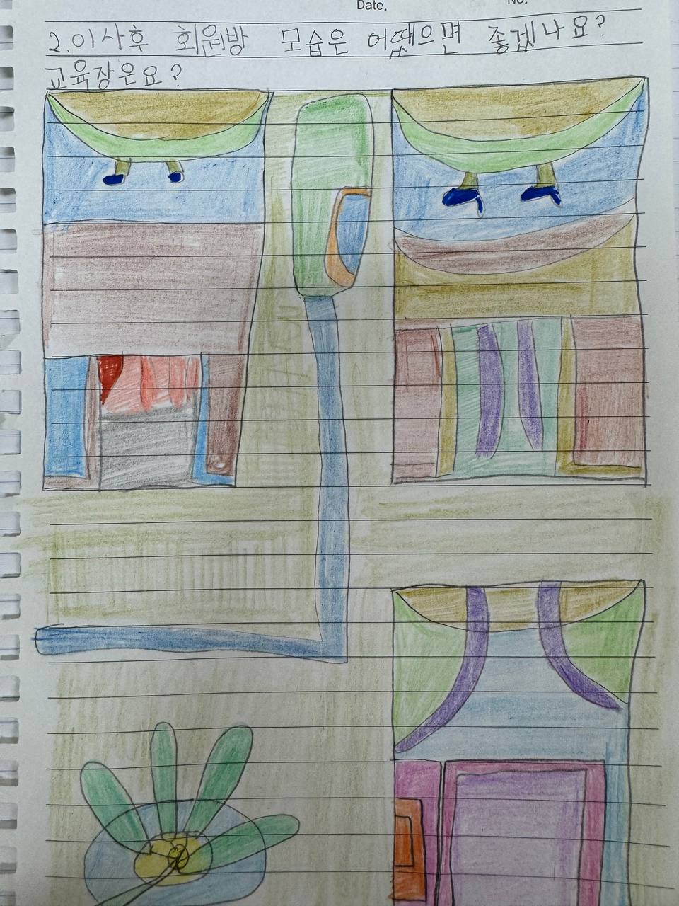 [사진 3] 이사 갈 사무실 교육장을 그린 그림. 노랑색 배경에 사무실, 책상 등 다채로운 색깔로 그려져 있는 모습.