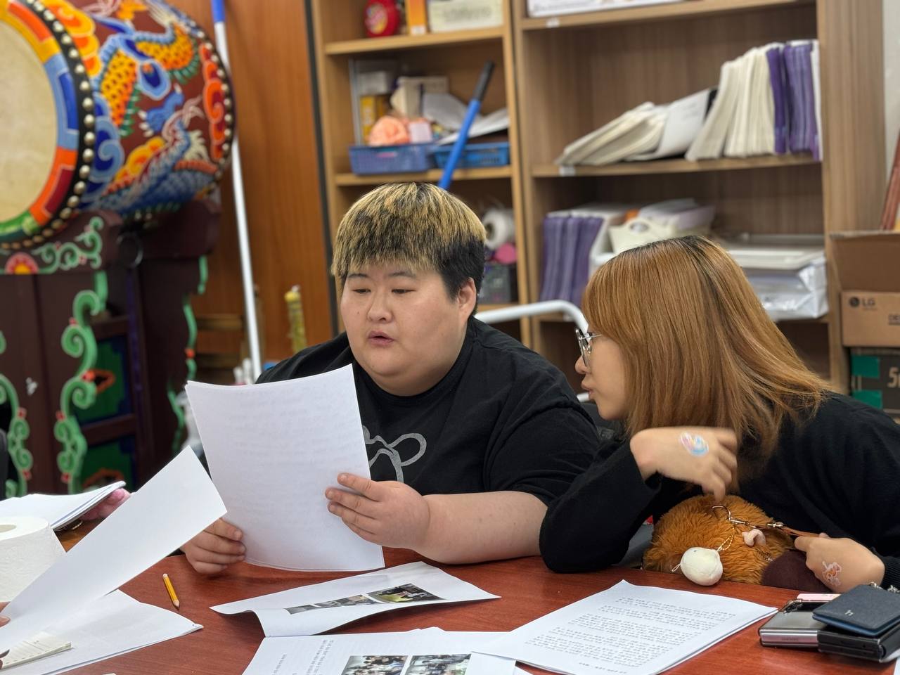 글을 읽고 있는 조화영 회원과 이를 보고 있는 서주영 회원의 모습.