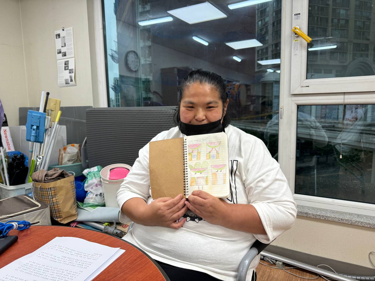 [사진 5] 자신이 그린 그림을 들고 웃고 있는 김상미 회원의 모습.