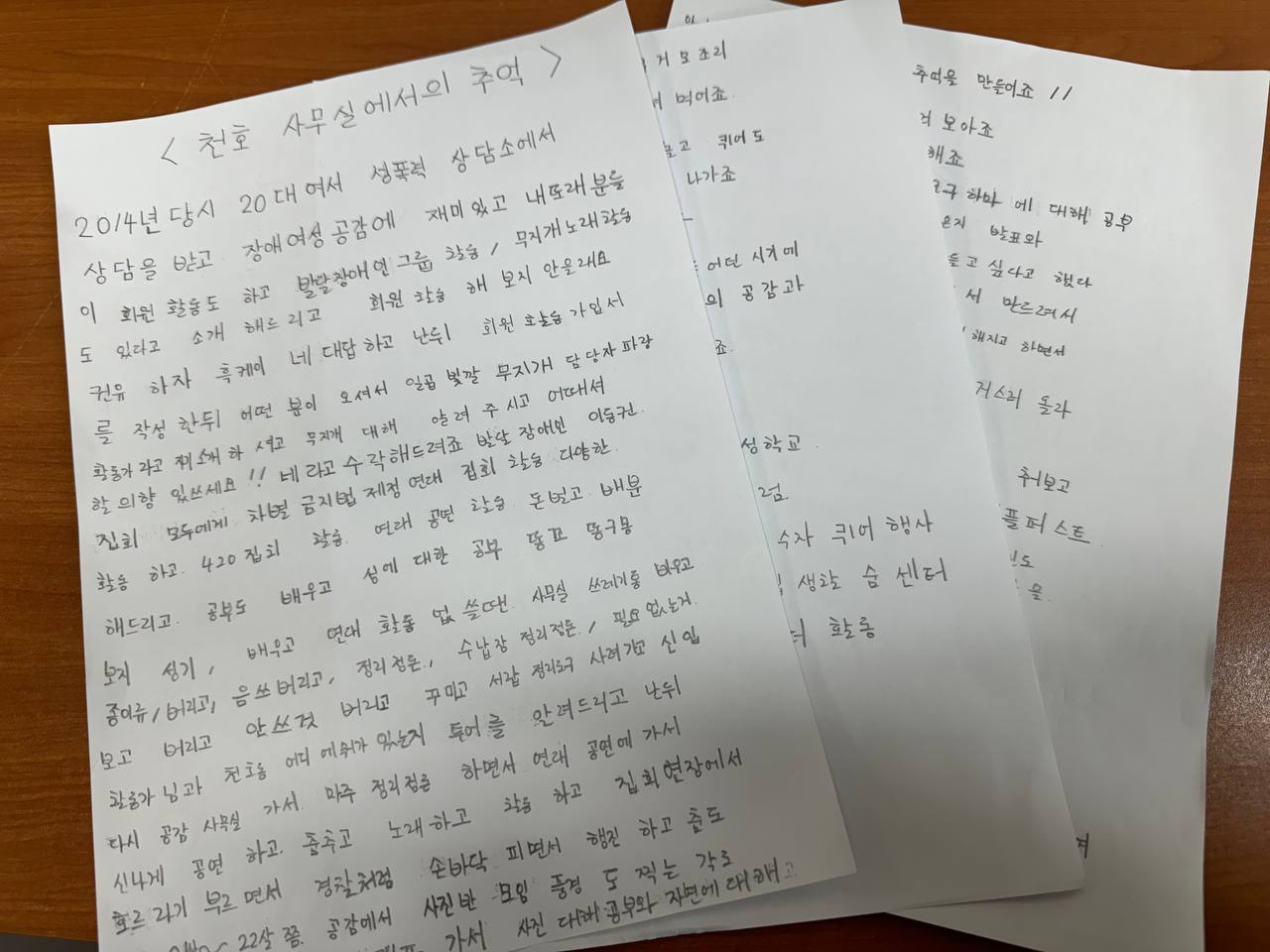 장애여성공감(이하 공감)은 11월 초 사무실 이사를 준비하고 있다. 비운다고 비웠지만 15년 간 묵은 자잘하고 큰 짐들이 산더미였다. 여전히 정리 중이지만, 이삿짐들을 모아둔 숨센터 정리를 앞두고 공감 활동가와 회원들은 역할을 나누고 손을 걷어붙였다. 오랜 회원들은 사무실 속속들이 알고 있기에  버리고 남길 것을 추리는 일은  한결 수월했다. 그렇게 같이 비운 숨센터, 지금은 임시 회원방인 이곳에서 우리는 “회원방은 어땠으면 좋겠는지, 어떤 활동을 하고 싶은지, 누구와 만나고 싶은지” 등 달라질 공간에 대한 걱정과 설렘, 천호동 사무실을 추억하는 이야기들을 담아 글로 전한다.