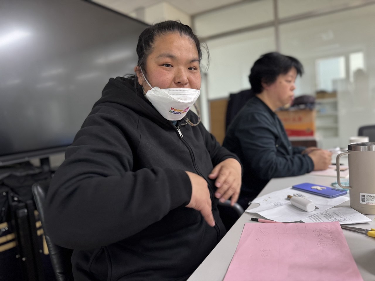 <사진 1. 화영이 상담실의 작은 테이블을 바라보며 공간구성에 대해 제안하고 있다. “테이블 옆에 의자 2개를 두면 상담소 활동가들이 있는 곳에 (회원님들이) 같이 얘기하면서 기다릴 수 있으니까”>