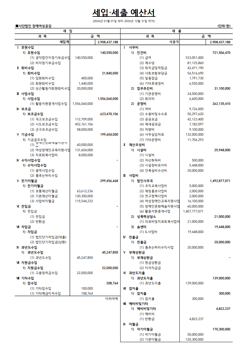장애여성공감 2026년 전체 세입세출 예산서