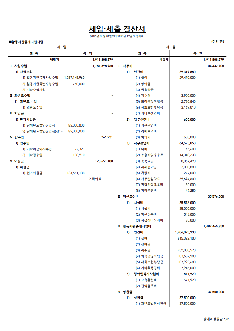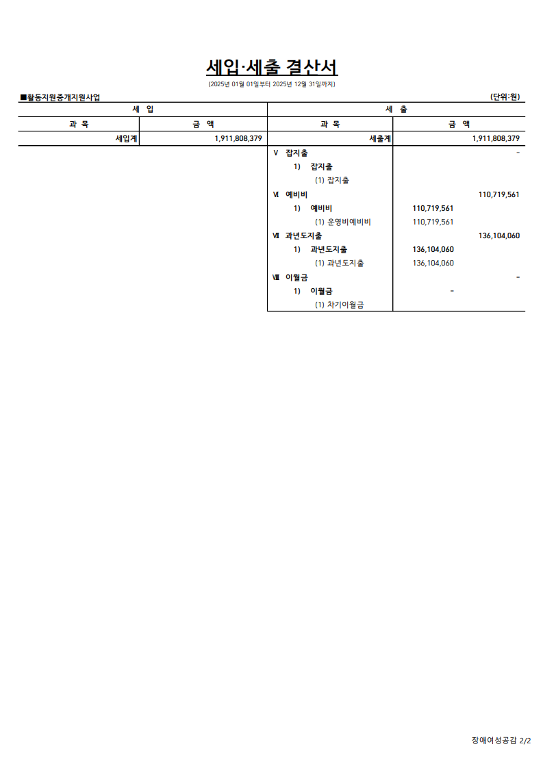 장애인활동지원중개사업 2025년 세입세출 결산서