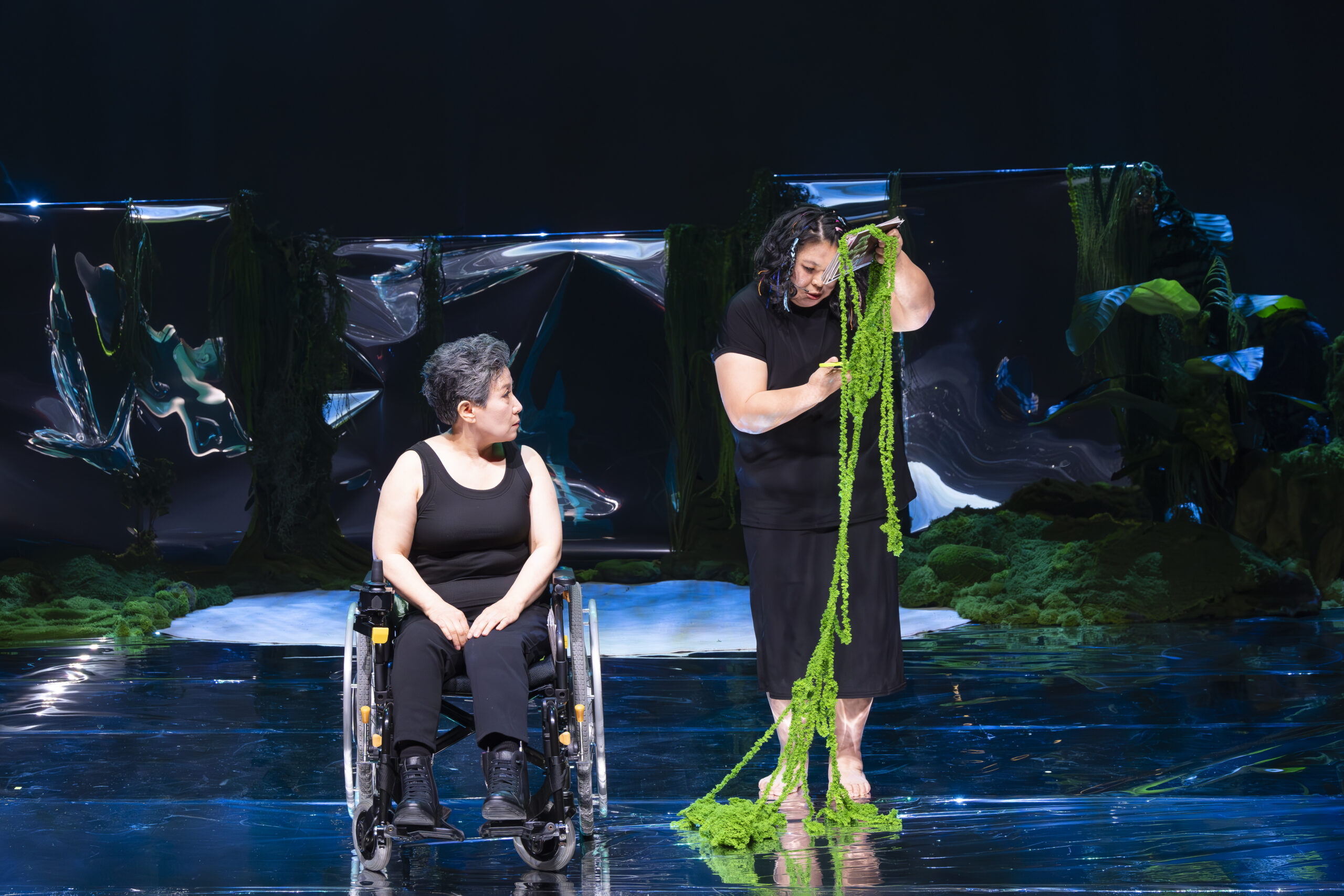 [사진4] 1장 기억집착 미진과 상미 공연 사진. 상미나 녹색뜨개실을 가위로 자르고 있다.