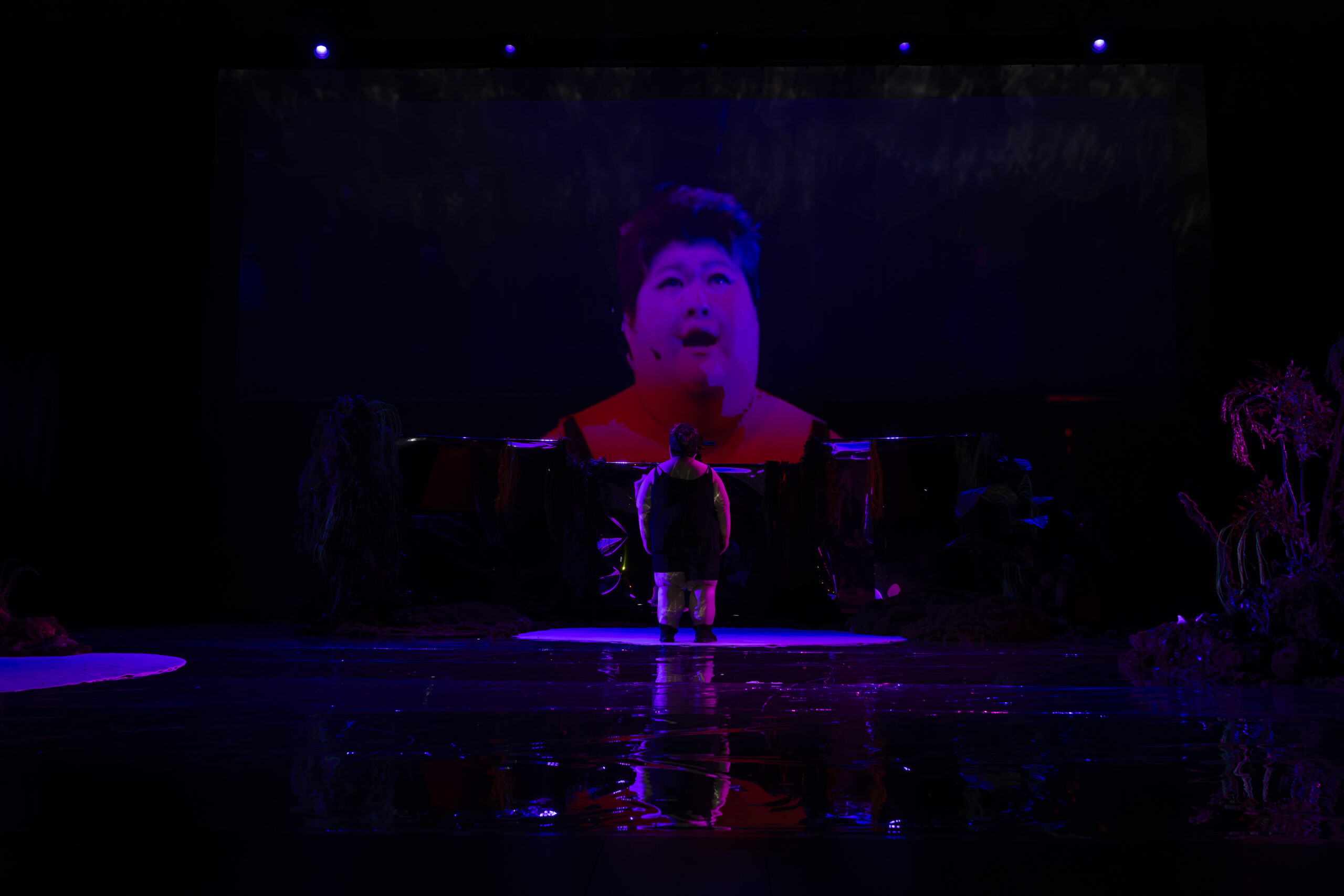 [사진1] 3장 인기욕심 화영의 공연 사진. 무대 실시간 영상 스크린에 비친 자신을 보고 있다.