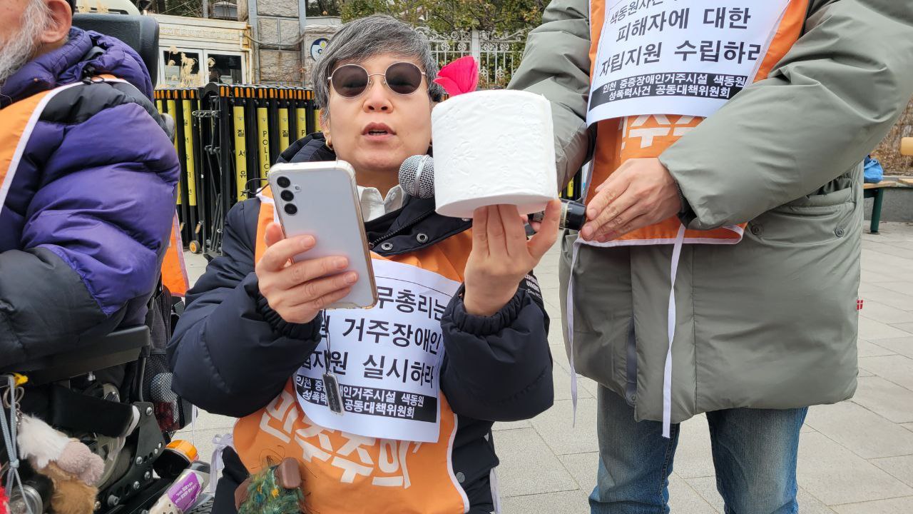 [사진1] 2월 24일 색동원 범정부 TF 자립지원 촉구 기자회견 “김민석 국무총리는 색동원 거주장애인 ‘시설뺑뺑이’ 중단하고 자립지원 실시하라!”에 김미진 활동가가 두루마리 휴지를 들고 발언하고 있다.